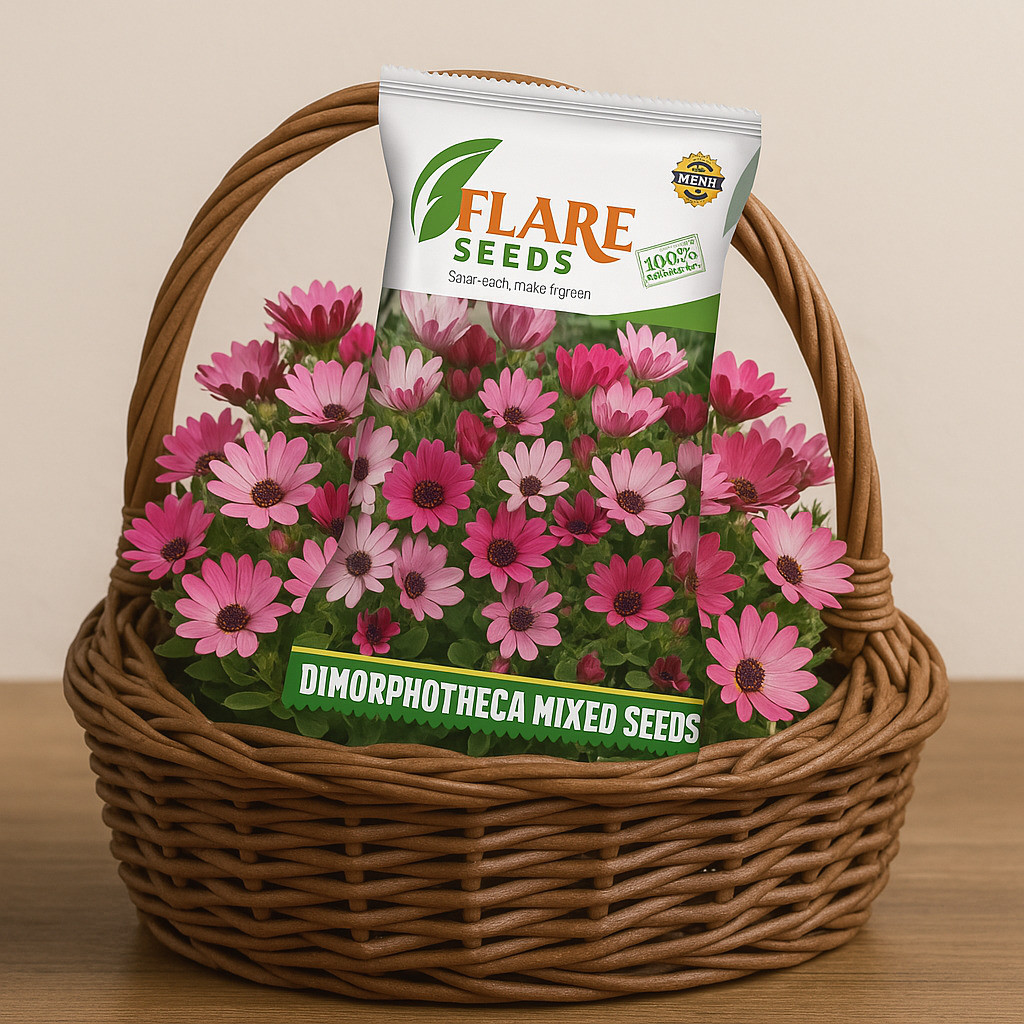 Dimorphotheca Mix flower seeds produce a vibrant blend of daisy-like flowers, typically in shades of white, yellow, orange, and purple, often with contrasting centers. These annuals (sometimes perennial in milder climates) form bushy plants with lance-shaped leaves. They are known for their prolific blooming, especially in sunny conditions, creating a cheerful and colorful display. Dimorphotheca, also known as African Daisy or Cape Marigold, is relatively low-maintenance and attractive to pollinators, adding a bright touch to Delhi gardens during the cooler months.
